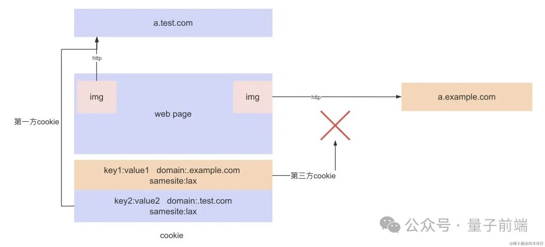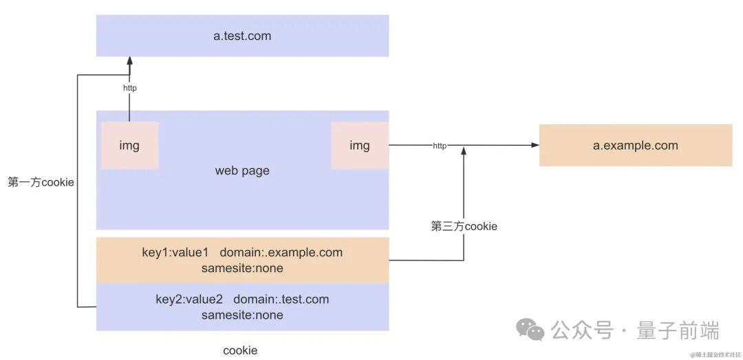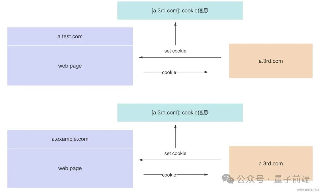 第三方 cookie:非当前域名下的服务器设置的 cookie。例如上图中当前网页访问的是a.test.com网站, 请求了a.example.com的图片资源,a.example.com即为第三方。