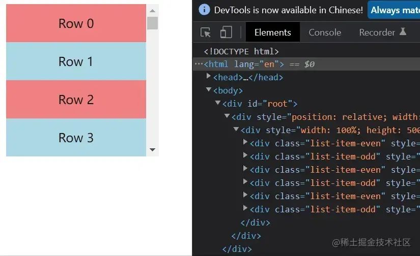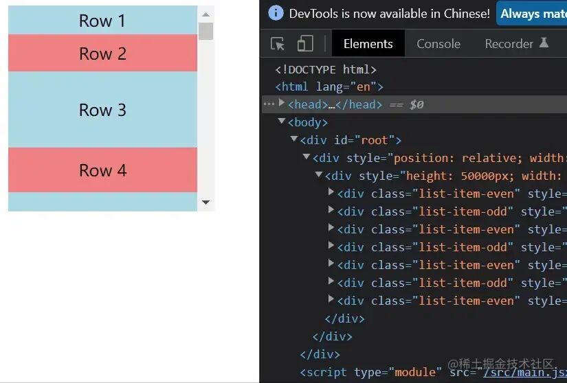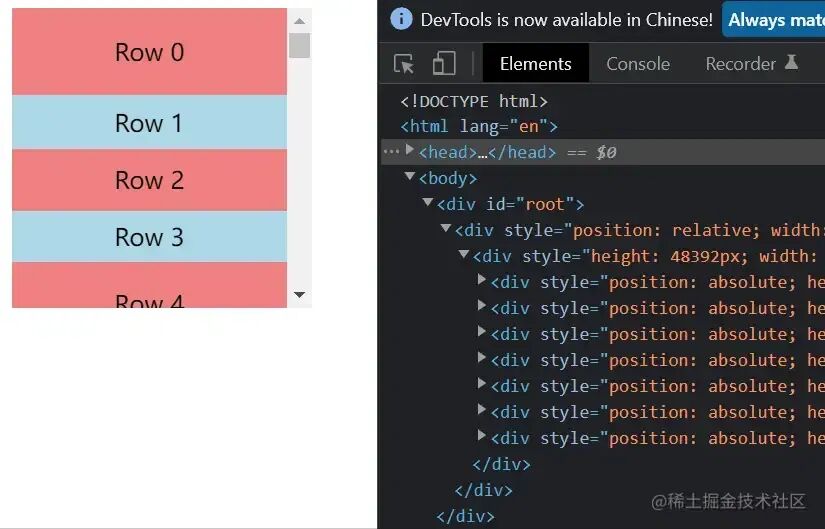 }从上面代码可以看出,我们没将 itemSize 传过去,虚拟列表是不知道每一个元素的高度的,只有在渲染的时候执行了 Row 才知道。