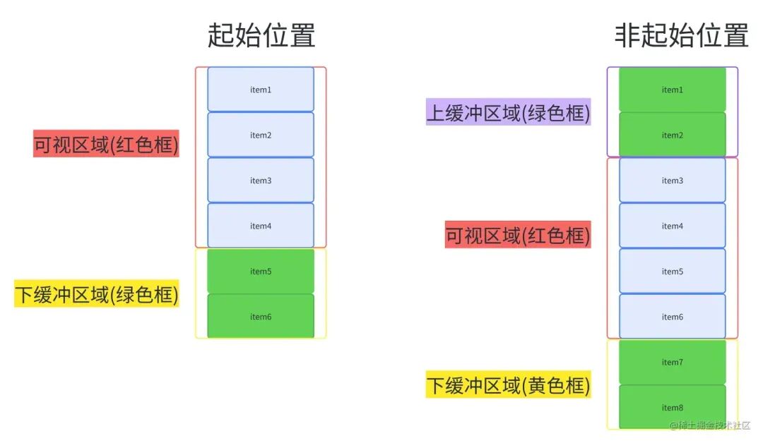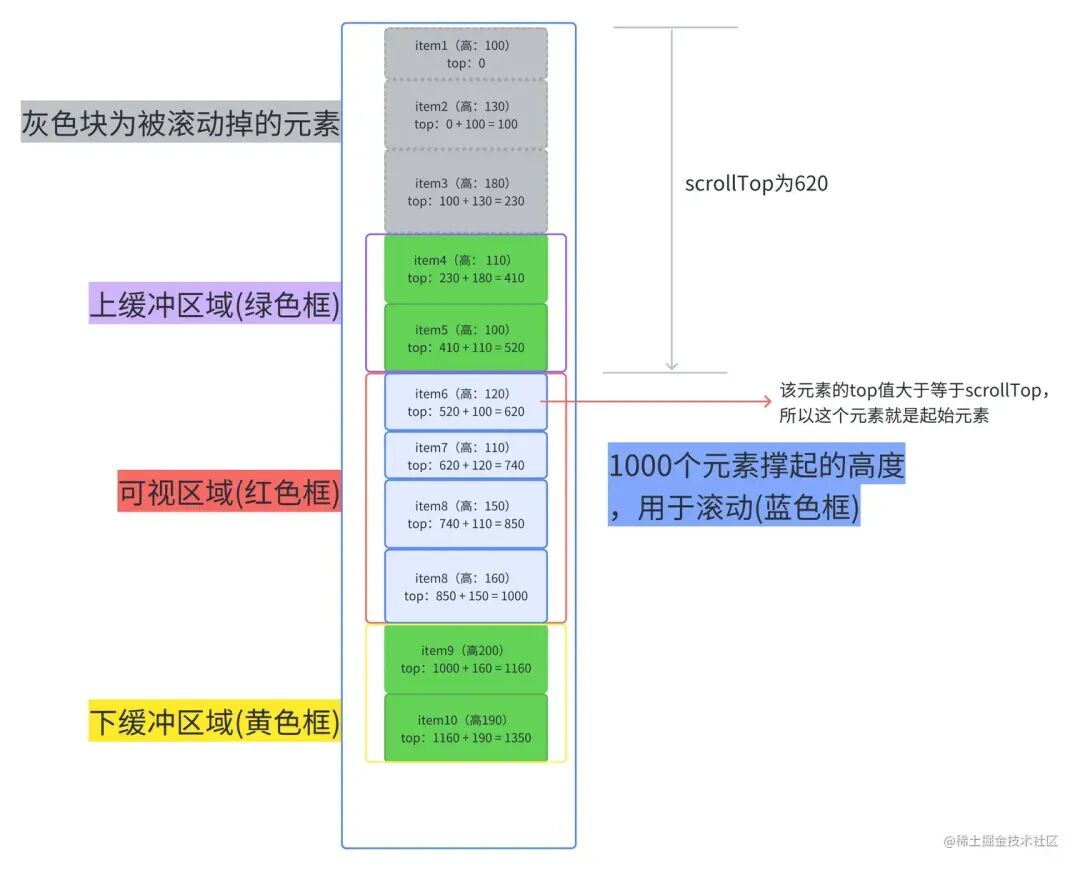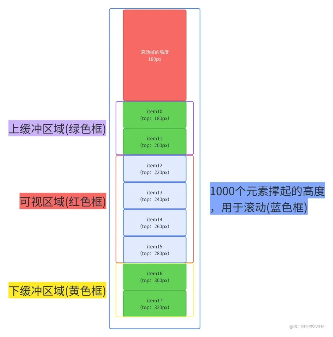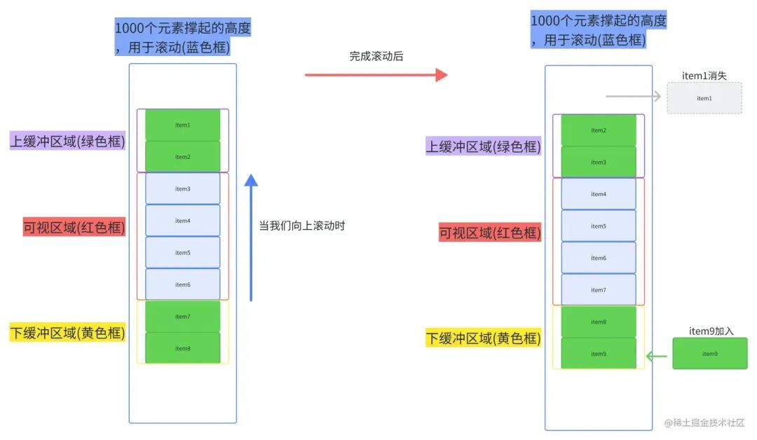 从上面两图我们可以总结出,整个虚拟列表划分为三个区域,分别是上缓冲区 (0/2 个元素),可视区 (n 个元素),下缓冲区 (2 个元素)。当我们滚动到一个元素离开可视区范围内时,就去掉上缓冲区顶上的一个元素,然后再下缓冲区增加一个元素。这就是虚拟列表的核心原理了。
