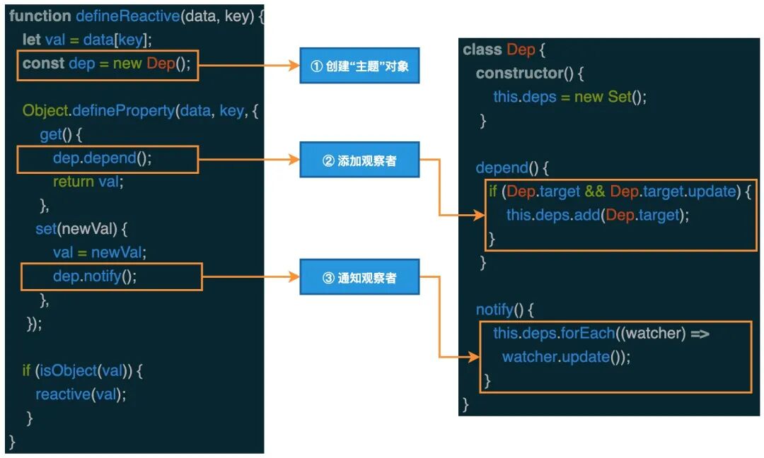 上面的描述看起来比较绕,其实要实现自动更新,我们就是要让 ① 创建主题对象、② 添加观察者、③ 通知观察者 这三个步骤实现自动化,这就是实现响应式的核心思路。接下来,我们来举一个具体的示例: