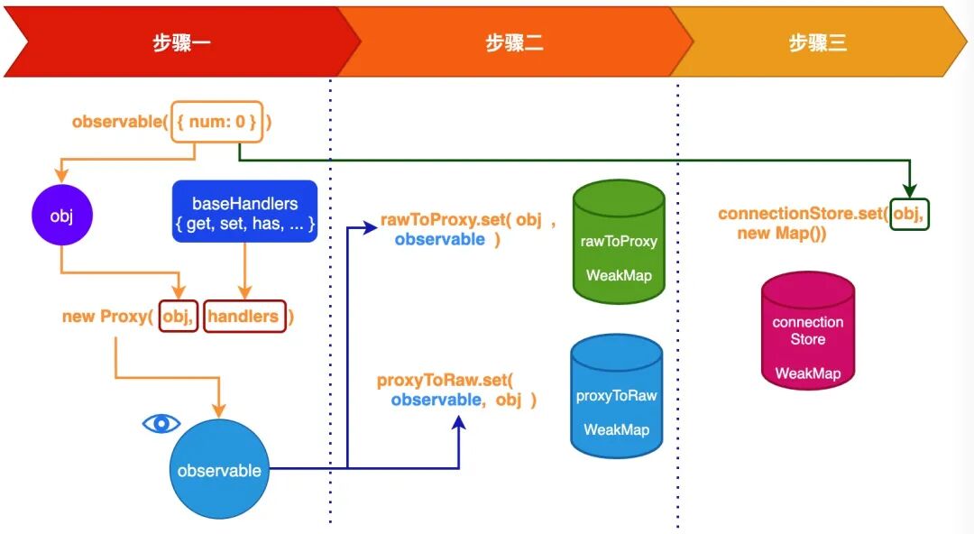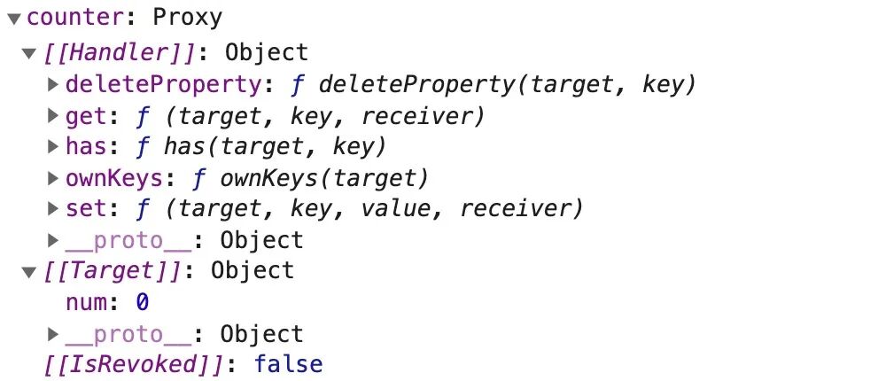 function createObservable (obj) { const handlers = builtIns.getHandlers(obj) || baseHandlers const observable = new Proxy(obj, handlers) // 保存raw => proxy,proxy => raw 之间的映射关系 rawToProxy.set(obj, observable) proxyToRaw.set(observable, obj) storeObservable(obj) return observable}通过观察以上代码,我们就知道了为什么调用 observable({ num: 0 }) 函数之后,返回的是一个 Proxy 对象。对于 Proxy 的构造函数来说,它支持两个参数: