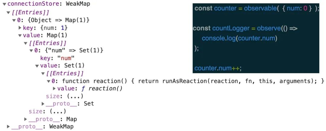 import { observable, observe } from '@nx-js/observer-util';const counter = observable({ num: 0 }); // Aconst countLogger = observe(() => console.log(counter.num)); // Bcounter.num++; // C在第 A 行中,我们通过 observable 函数创建了可观察的 counter 对象,该对象的内部结构如下: