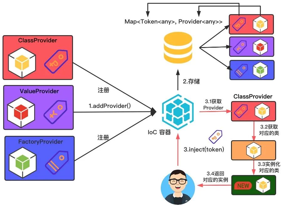 了解完装饰器与反射相关的基础知识,接下来我们来开始实现 IoC 容器。我们的 IoC 容器将使用两个主要的概念:令牌(Token)和提供者(Provider)。令牌是 IoC 容器所要创建对象的标识符,而提供者用于描述如何创建这些对象。