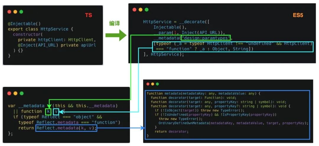 // 忽略__decorate函数等代码var __metadata = (this && this.__metadata) || function (k, v) { if (typeof Reflect === "object" && typeof Reflect.metadata === "function") return Reflect.metadata(k, v);};var HttpService = /** @class */ (function () { function HttpService(httpClient) { this.httpClient = httpClient; } var _a; HttpService = __decorate([ Injectable(), __metadata("design:paramtypes", [typeof (_a = typeof HttpClient !== "undefined" && HttpClient) === "function" ? _a : Object]) ], HttpService); return HttpService;}());通过观察上述代码,你会发现 HttpService 构造函数中 httpClient 参数的类型被擦除了,这是因为 JavaScript 是弱类型语言。那么如何在运行时,保证注入正确类型的依赖对象呢?这里 TypeScript 使用 reflect-metadata 这个第三方库来存储额外的类型信息。