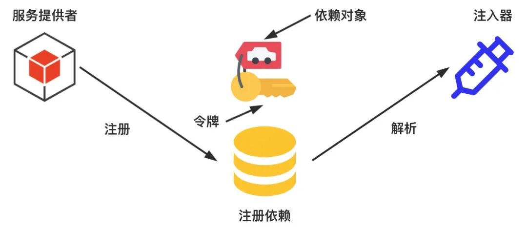 以前面汽车的例子为例,我们可以把汽车、发动机、底盘和车身这些认为是一种 “服务”,所以它们会以服务提供者的形式注册到 DI 系统中。为了能区分不同服务,我们需要使用不同的令牌(Token)来标识它们。接着我们会基于已注册的服务提供者创建注入器对象。