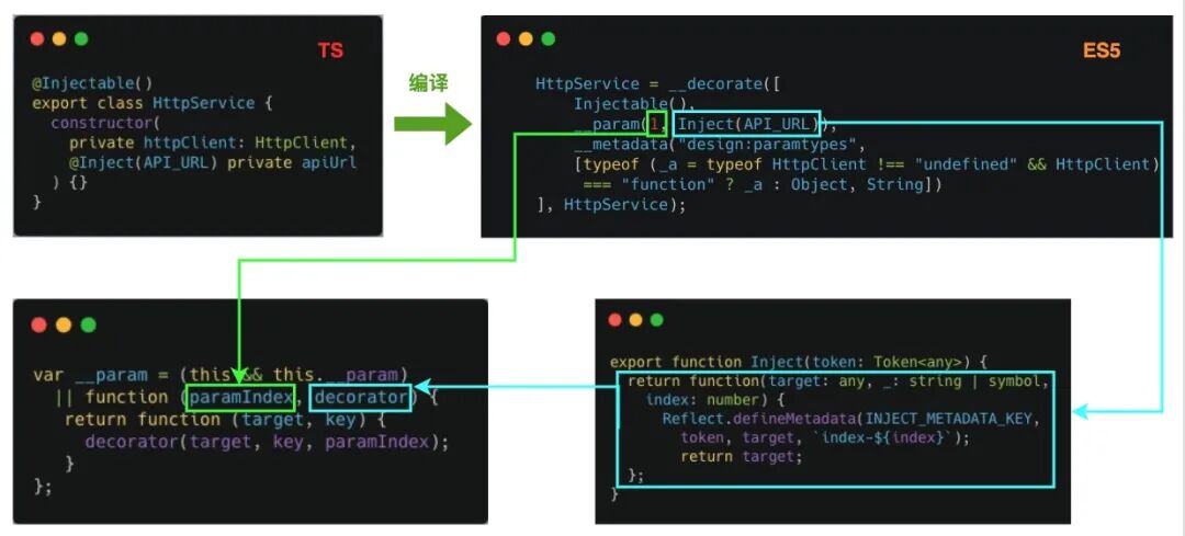 const API_URL = new InjectionToken('apiUrl');@Injectable()export class HttpService { constructor( private httpClient: HttpClient, @Inject(API_URL) private apiUrl: string ) {}}以上代码若设置编译的目标为 ES5,则会生成以下代码: