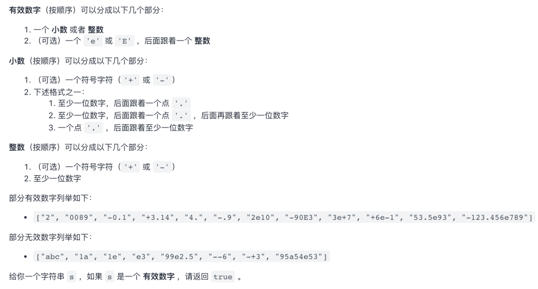 部分无效数字列举如下:["abc", "1a", "1e", "e3", "99e2.5", "--6", "-+3", "95a54e53"]