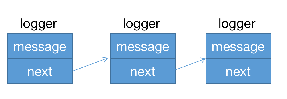 Writting to stdout: Entering function y.Writting to stdout: Step1 completed.Sending via email: Step1 completed.Writting to stdout: An error has occurred.Sending via email: An error has occurred.Sending to stderr: An error has occurred.每个 logger 都继承了 message 方法,并且拥有的 next 也指向一个 logger 对象,通过 next 去调用下一个的 message 方法。