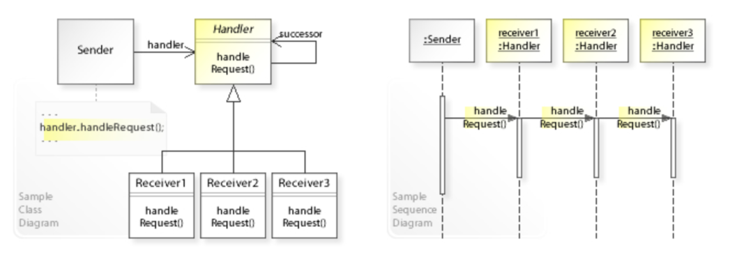 Sender 无需关心哪一个 Receiver 去处理它,只需要通过 Handler 接口在 Receiver 链条中进行处理,每一个 Receiver 处理结束后继续传给下一个 Receiver 。