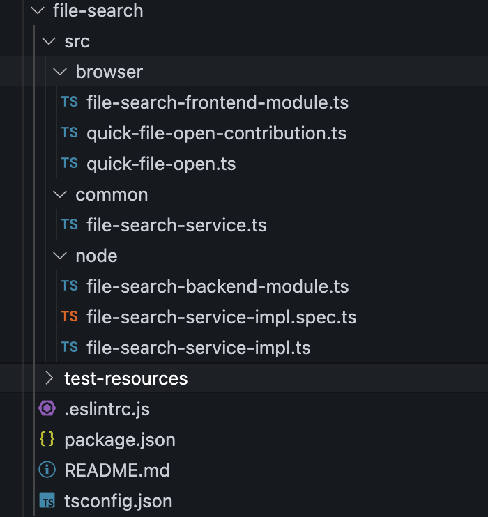 因为 Theia 由前后端两个子应用组成,所以 Extension 一般也由前后端两部分组成,其典型目录结构为: