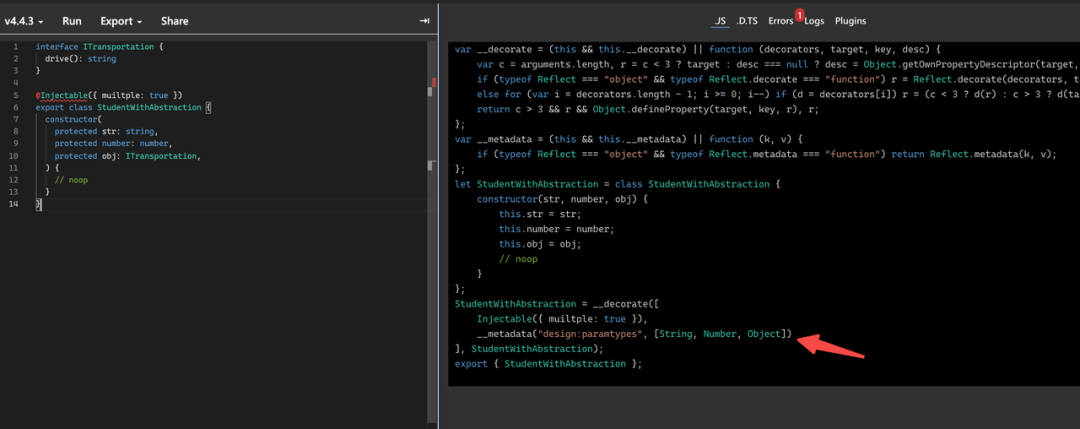 interface ITransportation { drive(): string}@Injectable({ muiltple: true })export class StudentWithAbstraction extends Student { constructor(protected transportation: ITransportation) { super(transportation); }}如果这样写的话,会发现依赖解析出来会是错误的;因为在 TS 编译的时候,interface 是一个类型,运行时就会变成类型所对应的构造对象,无法正确解析依赖。