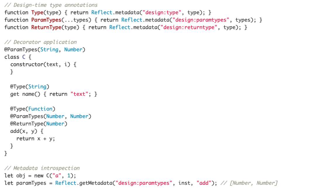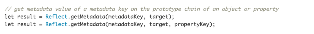 const args = Reflect.getMetadata("design:paramtypes", Student)expect(args).toEqual([Transportation])反射元数据的提案:https://rbuckton.github.io/reflect-metadata/#syntax