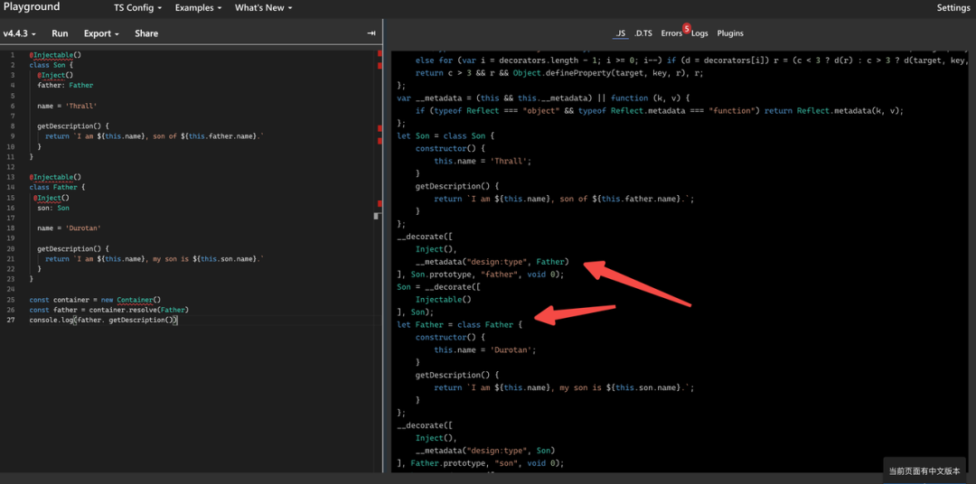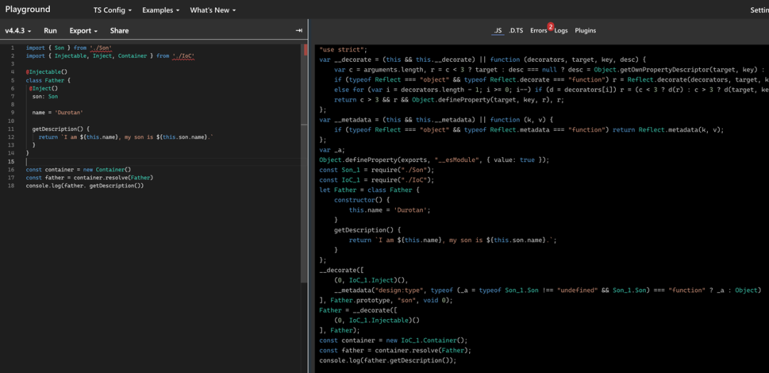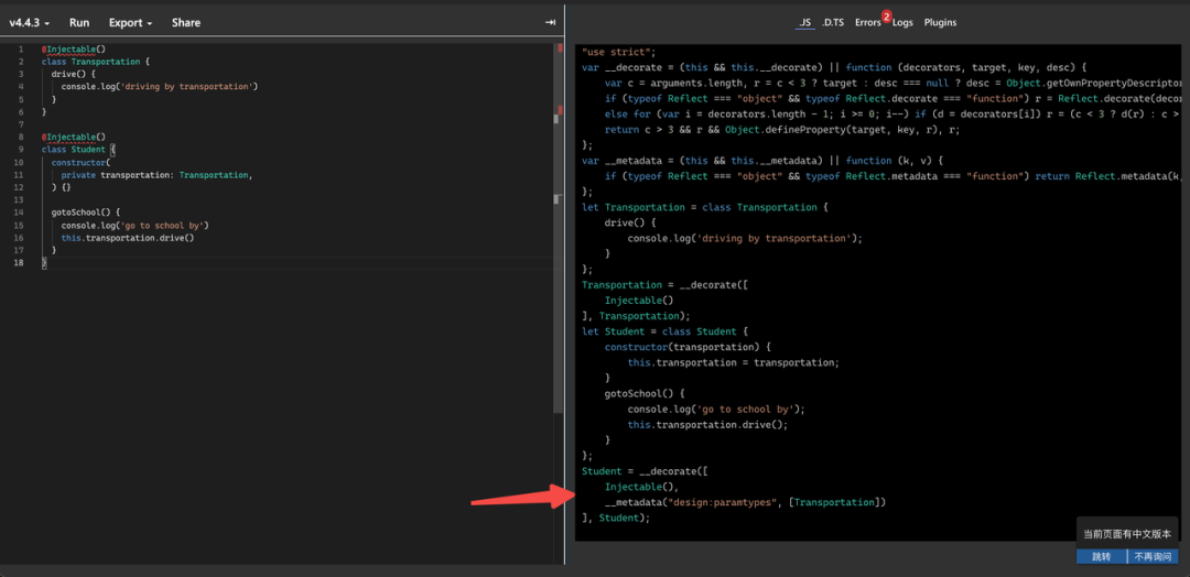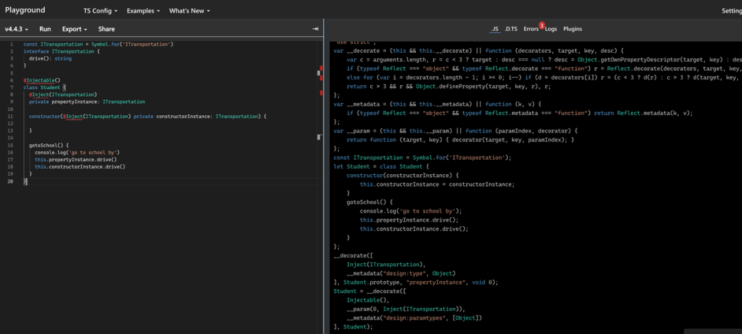 那么首先让我们来看一下构造函数的依赖是怎么分析出来的。开启了装饰器和元数据的功能之后,前面的代码尝试在 TS 的 playground 进行一次编译,能够看到运行的 JS 代码是这样的。