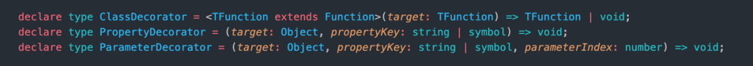 我们结合 TS 编译的结果和类型定义,来看看 ParameterDecorator 和 PropertyDecorator 的特征。