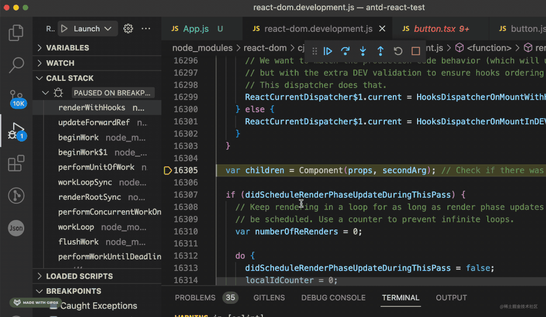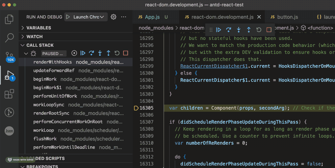 所有函数组件都是在这里被调用的,而 antd 的组件也全部是函数组件,那么我们在这里加个断点,打名字为 Button 的函数组件被调用的时候断住不就行了?