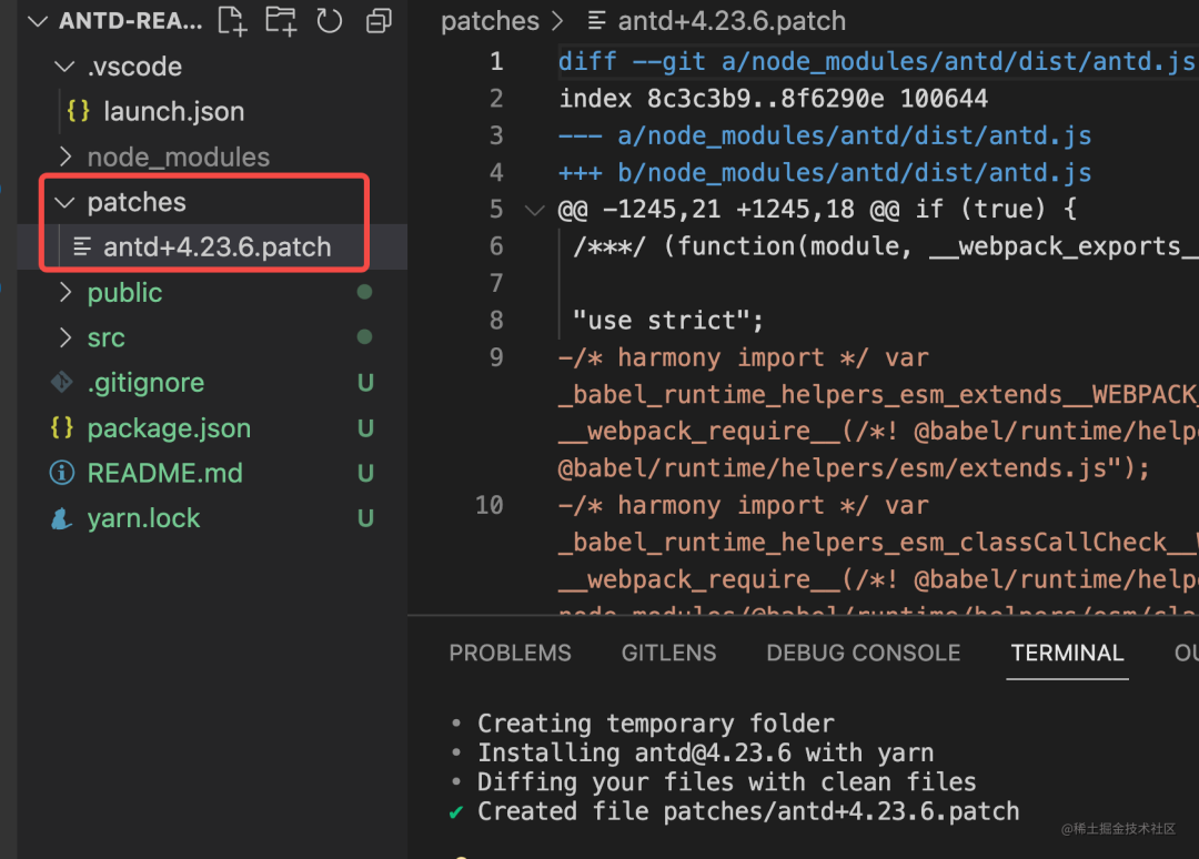 patch 文件里记录了你对 antd 包的改动,这个可以上传到 git 仓库,其他小伙伴拉下来再执行 npx patch-package 就会自动应用这些改动。