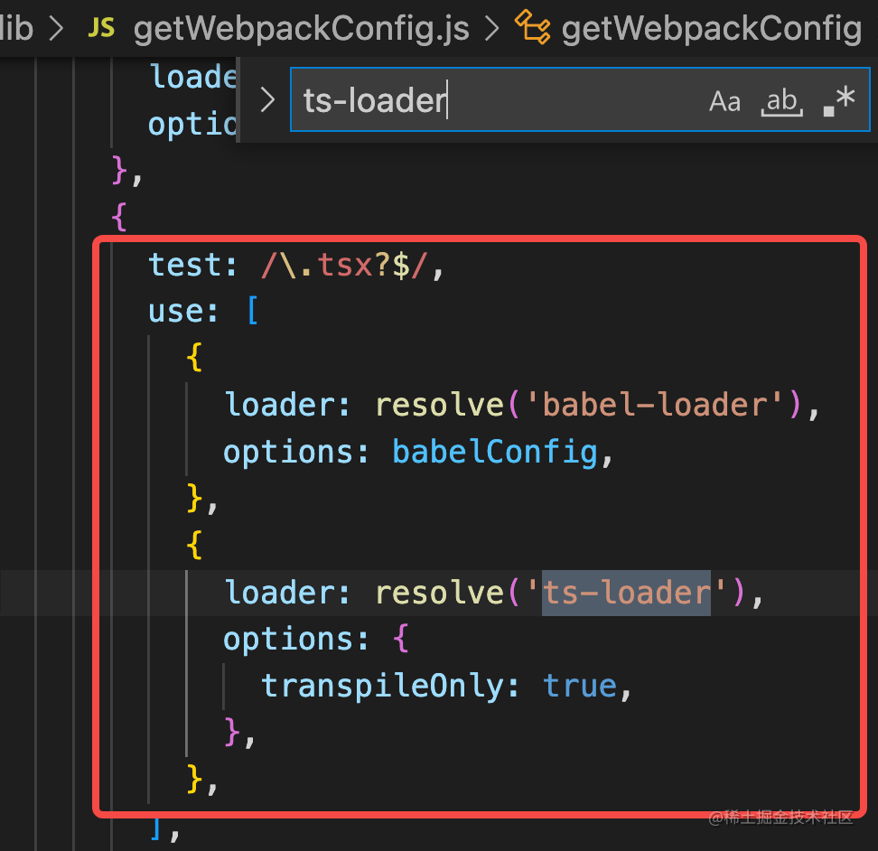 确实就像我们分析的,tsx 会经过 ts-loader 和 babel-loader 的处理。