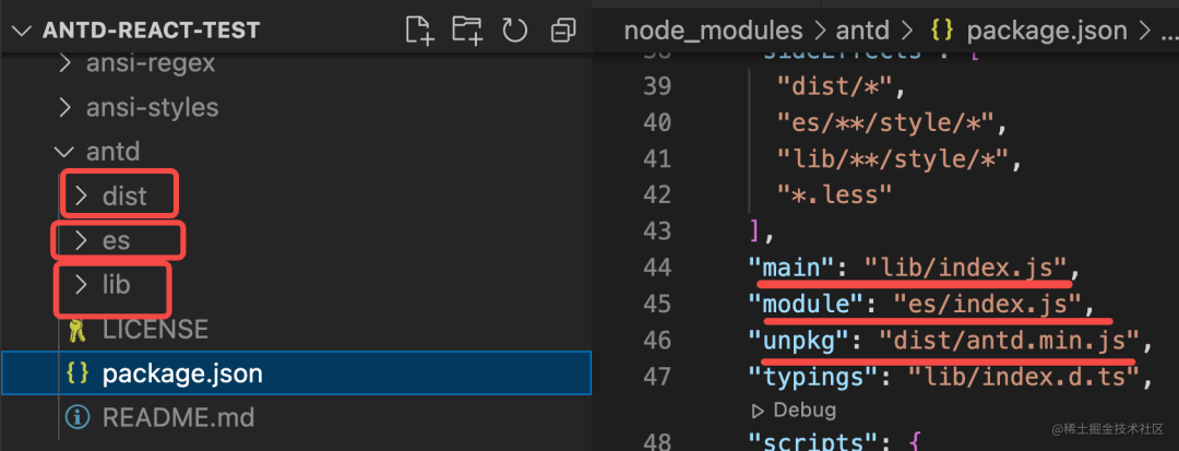 去 react 项目的 node_modules 下,找到 antd 的 package.json 看一下,你会发现它有三种入口: