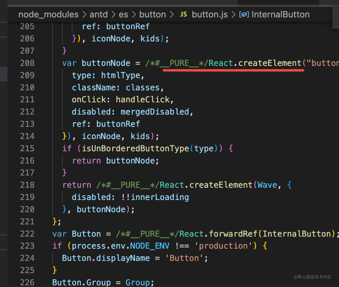 你会发现这确实是 Button 组件的源码,但却是被编译后的,比如 jsx 都被编译成了 React.createElement: