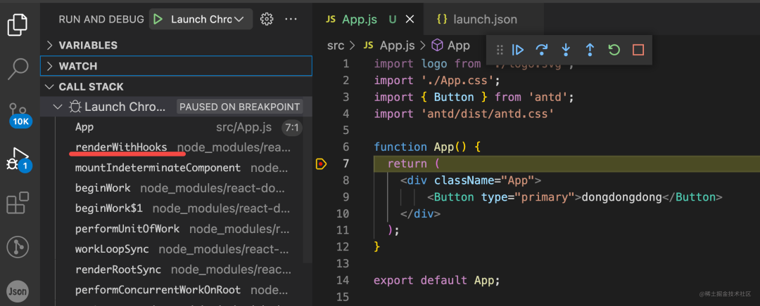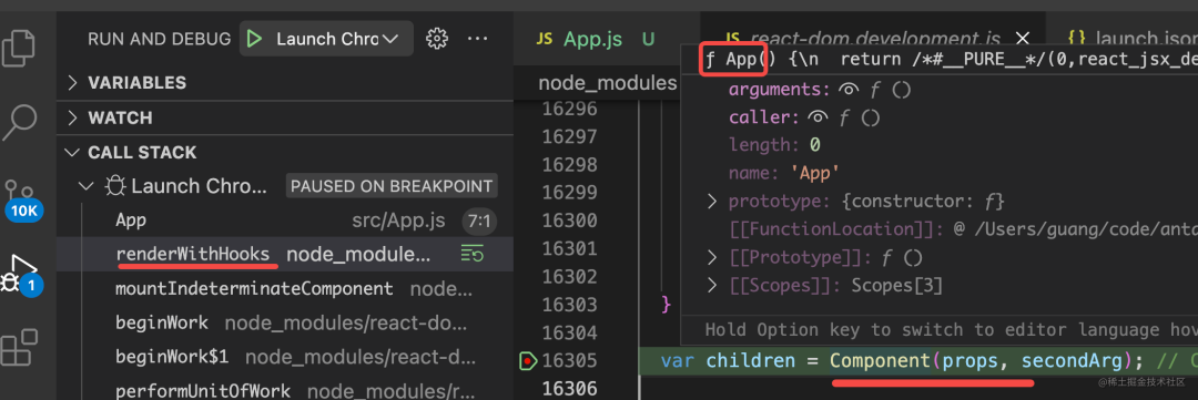 我们可以在 renderWithHooks 里调用函数组件的地方打个条件断点,在调用想调试的组件时断住,这样我们就可以 step into 到该组件定义的地方。