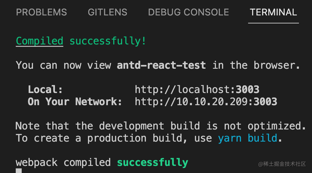 yarn create react-app antd-react-test<br style="visibility: visible;">创建成功后,进入到项目里,把 dev server 跑起来。
