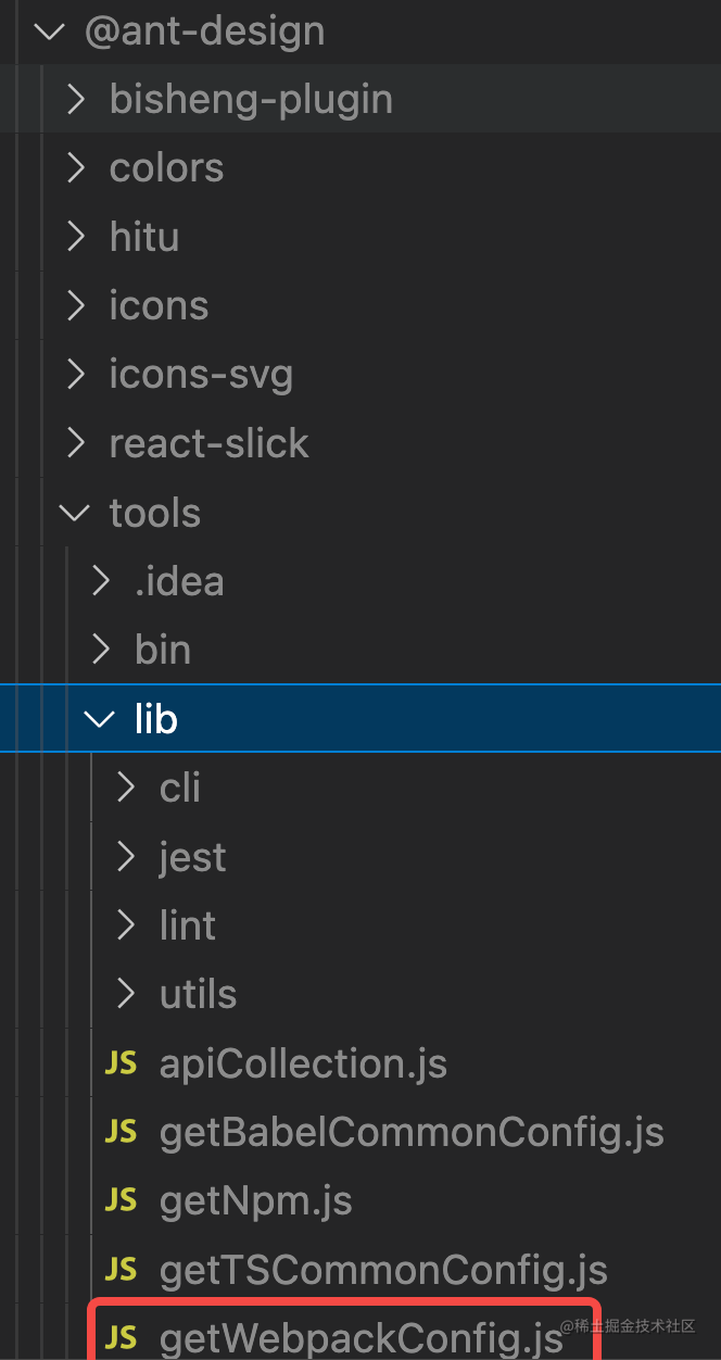 antd 的编译工具链在 @ant-design/tools 这个包里,从 antd/node_modules/@antd-design/tools/lib/getWebpackConfig.js 就可以找到 webpack 的配置:
