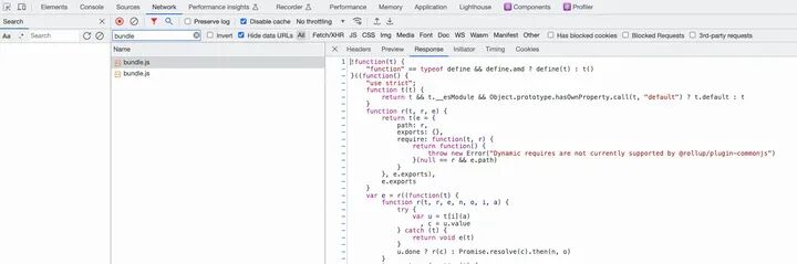 import nodeResolve from '@rollup/plugin-node-resolve'; // convert CommonJS modules to ES6 import commonjs from '@rollup/plugin-commonjs'; import nodePolyfills from 'rollup-plugin-node-polyfills'; import { babel } from '@rollup/plugin-babel'; import { terser } from 'rollup-plugin-terser'; export default [ { input: 'src/index.js', output: [ { file: 'lib/bundle.js', name: 'MyBundle', format: 'umd', sourcemap: 'hidden', compact: true, // 开启压缩 }, ], plugins: [ nodePolyfills(), nodeResolve(), commonjs(), babel({ babelHelpers: 'runtime', exclude: '**/node_modules/**', }), terser(), ], }, ];构建测试资源,可以看到在线上生成了 SourceMap 文件:
