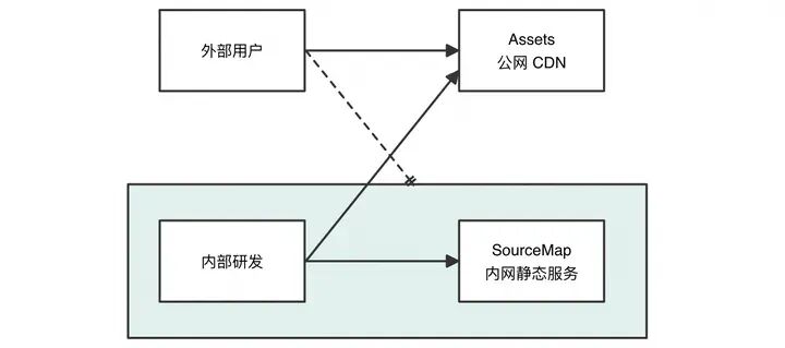 在构建时将 SourceMap 上传至某个私有的地址(如 CDN 或 OSS),然后利用 Webpack 插件将 sourceMappingURL 改为该私有地址。这样开发人员在打开 DevTools 时,Chrome 将根据 sourceMappingURL 直接加载实际的 SourceMap 地址,而外部用户则完全被隔离。原理展示如下: