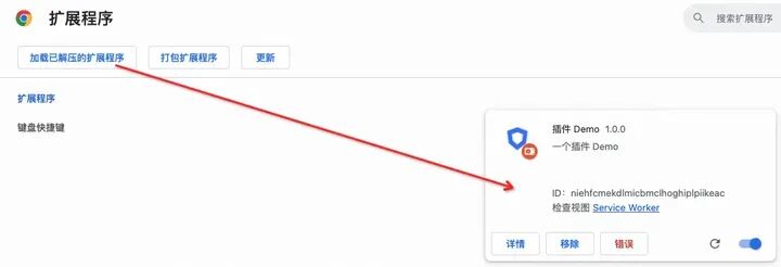 const REGEX = /^.*g\.alicdn\.com\/(马上到!|aimake|muyang-test)\/(.*)\.js.*/; const TARGET_TPL = 'https://sourcemap.def.alibaba-inc.com/sourcemap/$1/$2.js.map?enableCatchAll=true'; chrome.webRequest.onHeadersReceived.addListener( function(details) { if (details.url.match(REGEX)) { const targetUrl = details.url.replace(REGEX, TARGET_TPL); const headerSourcemap = { name: "sourcemap", value: targetUrl } const responseHeaders = details.responseHeaders.concat(headerSourcemap); return { responseHeaders }; } return { responseHeaders: details.responseHeaders }; }, // filters { urls: ['<all_urls>'], }, // extraInfoSpec ['blocking', 'responseHeaders', 'extraHeaders'] );为了测试效果,我们直接加载已解压的扩展程序: