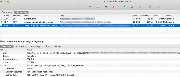 难道是 Chrome 加载 SourceMap 不需要通过网络请求?这显然不会,如果你有兴趣可以查看 issue,这其实是有意为之。不过我们仍然有其他手段看到 .map 文件的请求,打开 Charles 抓一把(涉及证书安装等操作本文不再赘述),就可以看到一堆迷途的请求:
