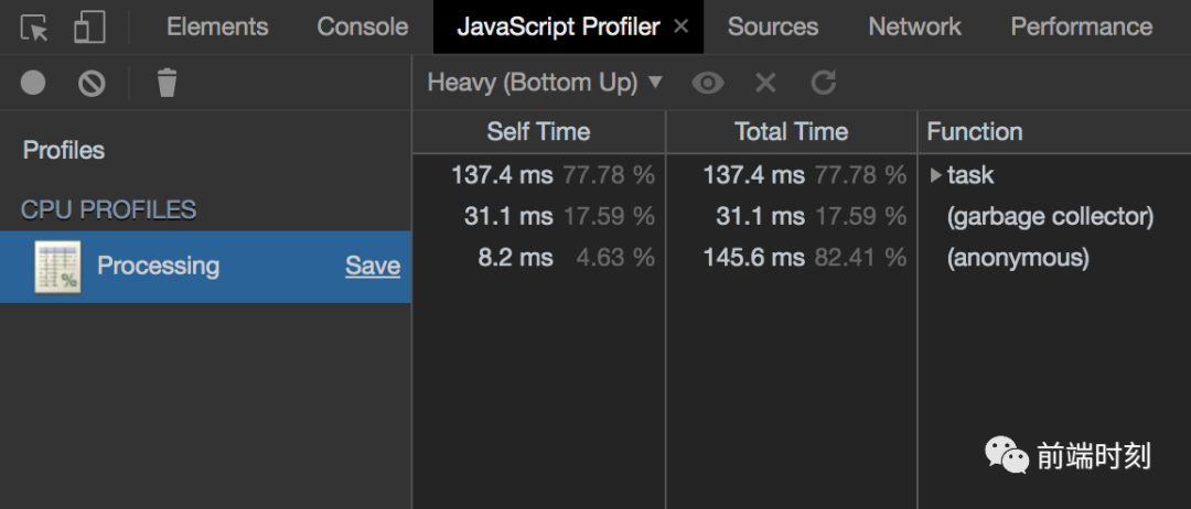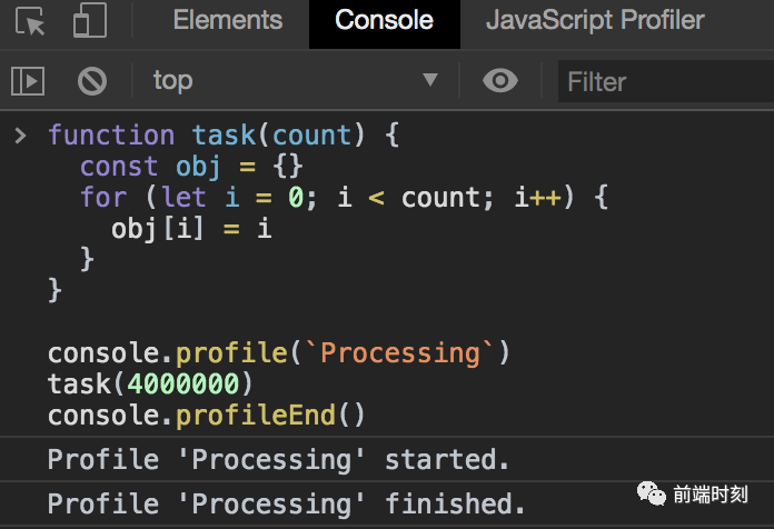 在 DevTools 窗口控制台中,调用 console.profile() 开启一个 JavaScript CPU 分析器. 结束分析器直接调用 console.profileEnd().