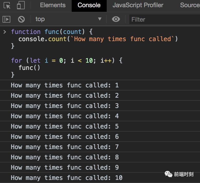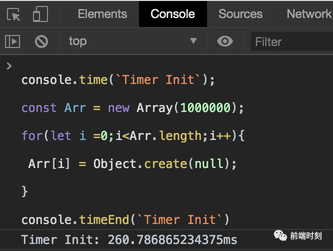 通过调用 time() 可以开启计时器。你必须传入一个字符串参数来唯一标记这个计时器的 ID。当你要结束计时的时候可以调用 timeEnd(),并且传入指定的名字。计时结束后控制台会打印计时器的名字和具体的时间。