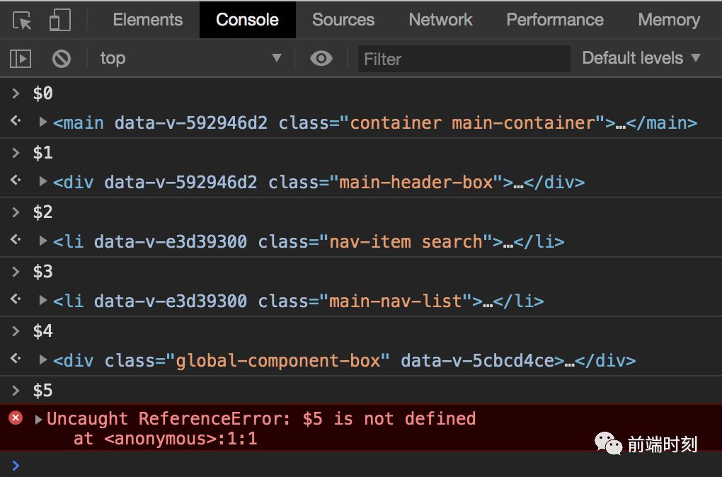 控制台会存储最近 5 个被选择的元素和对象。当你在元素面板选择一个元素或在分析器面板选择一个对象, 记录都会存储在栈中。可以使用 $x来操作历史栈, x 是从 0 开始计数的, 所以 $0 表示最近选择的元素, $4 表示最后选择的元素。