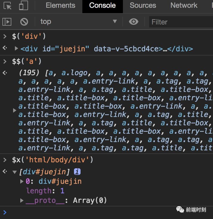 $()- 返回满足指定 CSS 规则的第一个元素,此方法为 document.querySelector() 的简化。$$()- 返回满足指定 CSS 规则的所有元素,此方法为 querySelectorAll() 的简化。$x()- 返回满足指定 XPath 的所有元素。