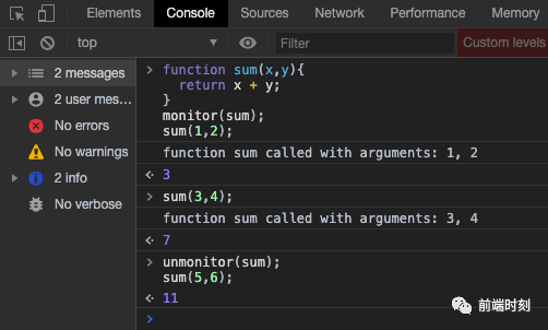 monitor(function), 当调用指定的函数时, 会将一条消息记录到控制台, 该消息指示调用时传递给该函数的函数名和参数。