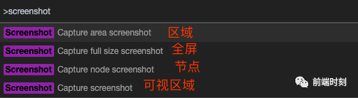 我们经常需要截图, Chrome DevTools 提供了 4 种截图方式, 基本覆盖了我们的需求场景, 快捷键 ctrl+shift+p , 打开 Command Menu, 输入 screenshot, 可以看到以下 4 个选项:
