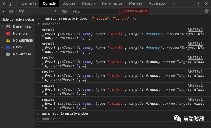 monitorEvents(object[, events]), 当指定的对象上发生指定的事件之一时, 事件对象将被记录到控制台。事件类型可以指定为单个事件或事件数组。