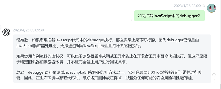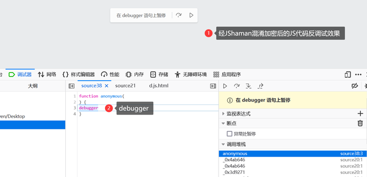 这是因为,debugger 更多的被人们用于反调试,比如用 JShaman 对 JavaScript 代码进行混淆加密后,就可以被加入多种不同的 debugger 指令用于反调试。