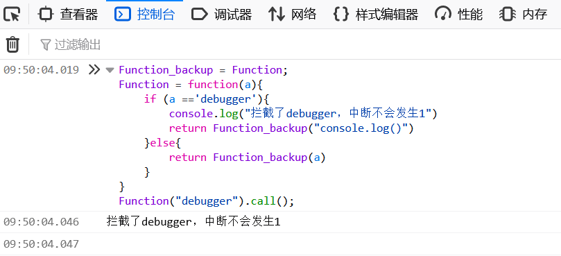 如果想要拦截 debugger,是不容易的,常用的函数替代、proxy 方法均对它无效,如: