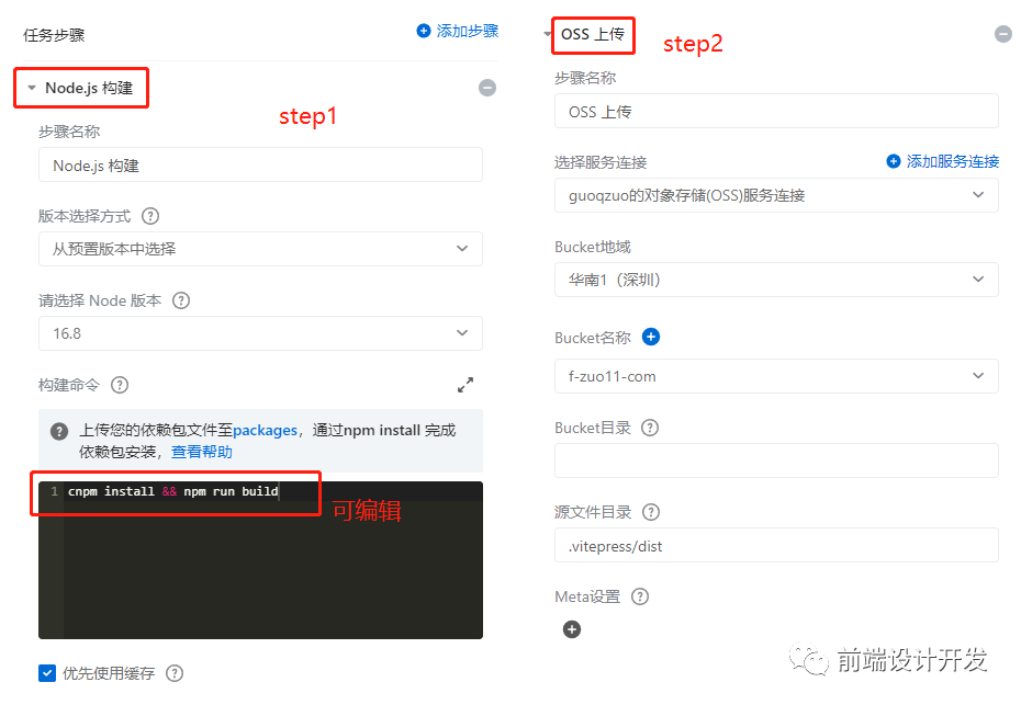 设置构建命令、构建生成文件目录,目标 oss