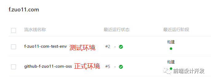 2、创建两个 OSS Bucket(f-zuo11-com、f-test-zuo11-com),分别对应两个环境,主分支用于正式环境,版本分支 (比如 v1.0.0) 用于测试环境
