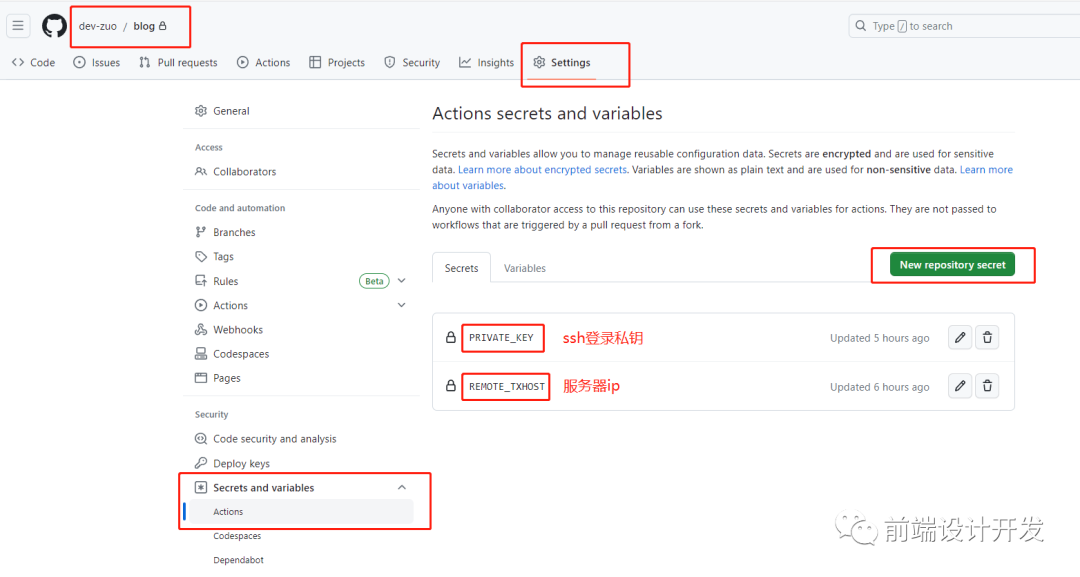 REMOTE_HOST: ${{ secrets.REMOTE_TXHOST }}在 actions 配置中 secrets 变量配置位置在:当前项目仓库的 Settings - Secrets and variables - Actions 中,如下图