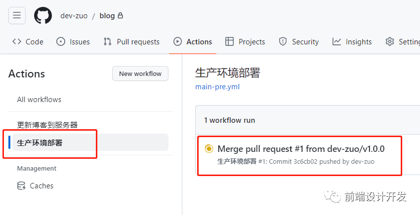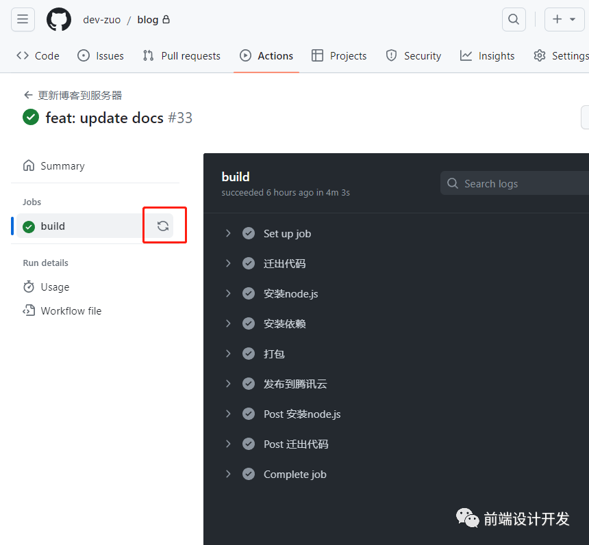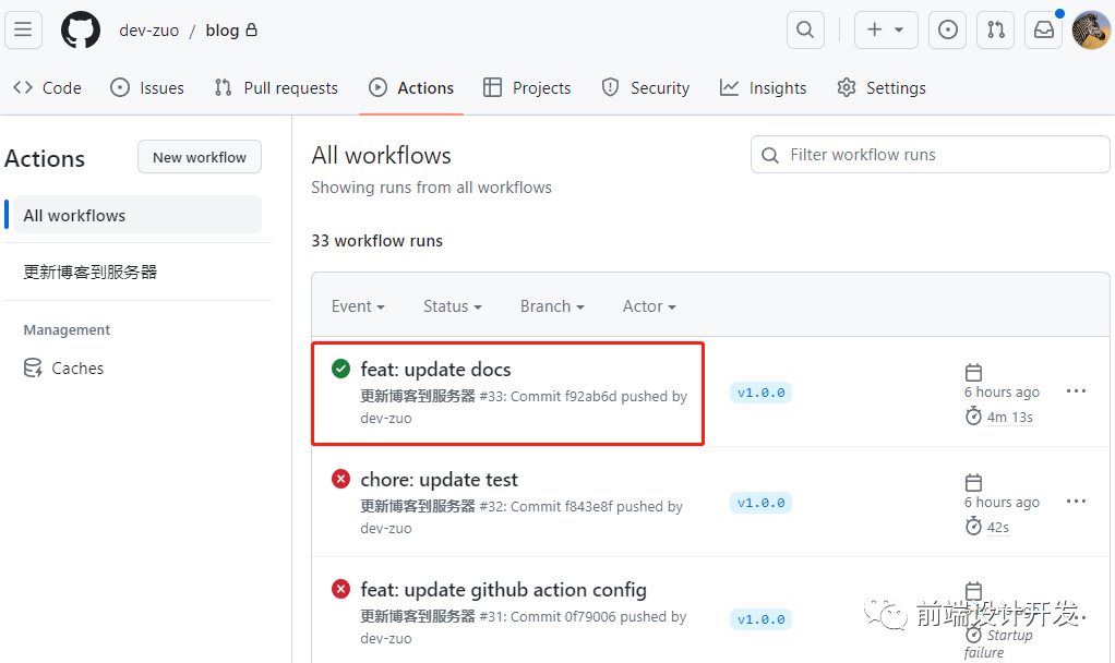 以上设置成功后,提交代码后 push 会自动执行 actions 部署,如下图