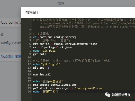 对应部署脚本:1、进入目录 2、拉取更新代码 3、npm install 4、pm2 重启接口服务 5、部署完成