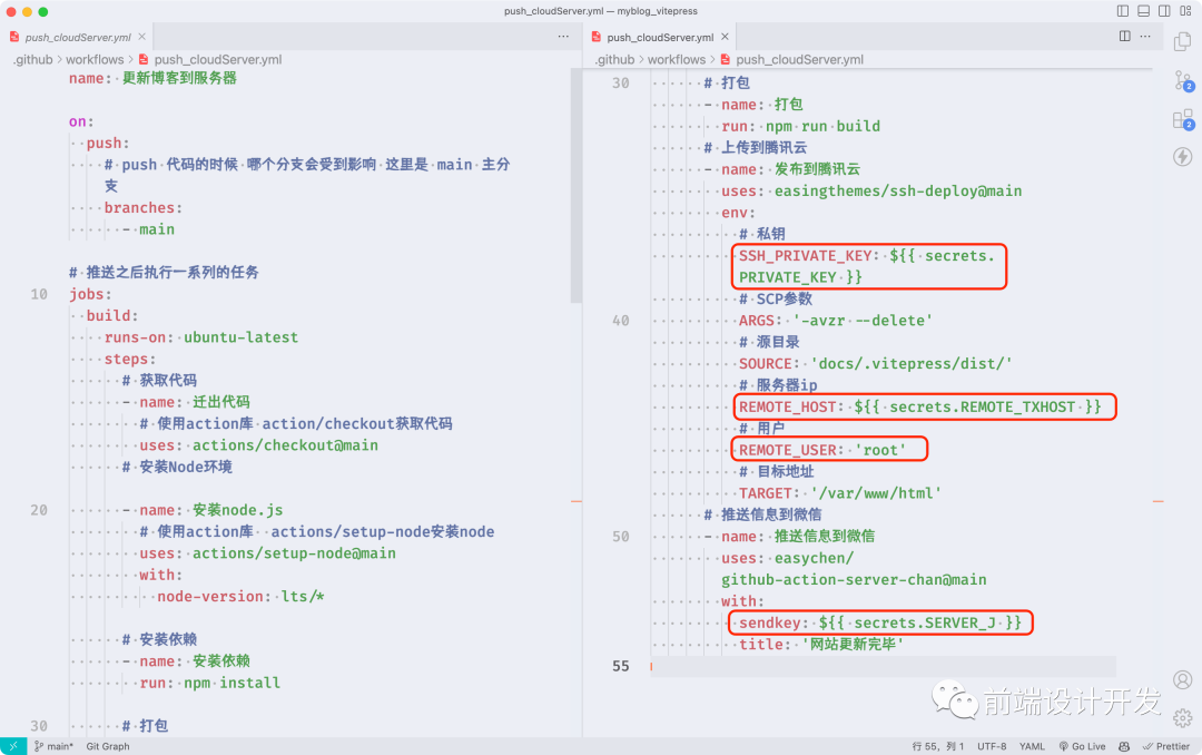 这里尝试将 github.com/dev-zuo/blog 中的 vitepress 项目部署到腾讯云服务器。首先在项目目录中添加 github ci 配置文件 .github/workflows/main.yml,内容如下,当 v1.0.0 分支有代码 push 时,就会自动触发 github actions 执行下面的 jobs 任务,触发部署流程:1、打包 2、构建 3、通过 ssh 登录到腾讯云服务器进行发布 4、微信通知(非必须)