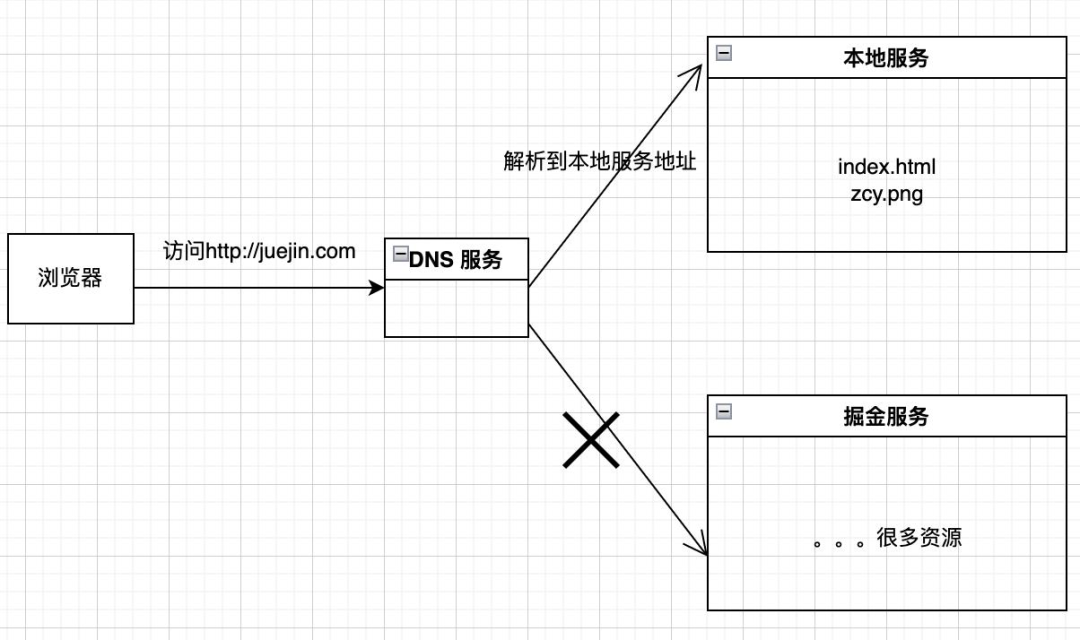 DNS 只是帮我们把域名解析成了 IP, HTTPS 还需要证书验证服务器身份,仅仅 DNS 拦截解析还不够。模拟实现了一波大致思路:自己启动一个静态资源服务,以及 DNS 本地解析服务,当访问 juejin.cn 域名的时候 IP 解析成本地的 IP 并且成功访问到静态资源,具体如下。