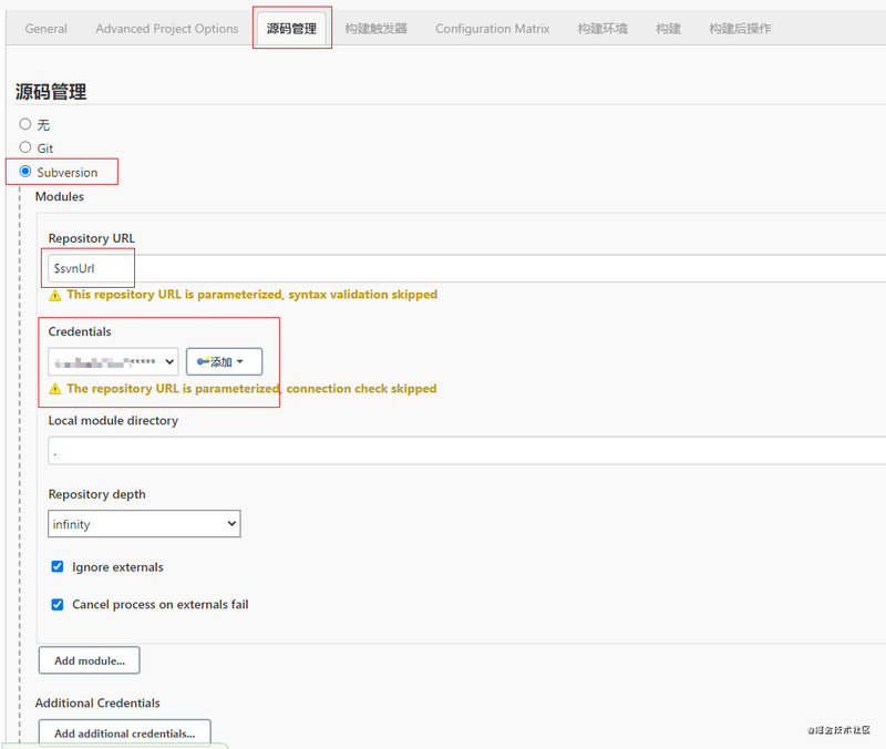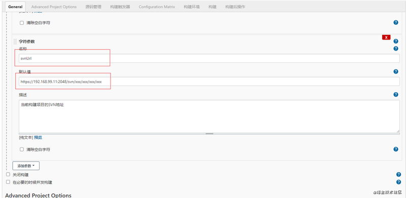由于是代码版本控制工具是 SVN,需要选择 Subversion 选项,在 Repository URL 中填入变量 $svnUrl。代表构建时使用传入的地址参数。