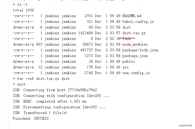此处的命令负责打印常见信息,并执行构建命令。在构建结束后将 dist 文件夹的内容压缩成压缩包:"dist.tar.gz"