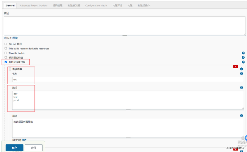添加参数化构建过程,用于处理不同情况处理的构建。这边需要关注两个参数 env, svnUrl,对应着:构建及发布环境、构建的 svn 版本号。
