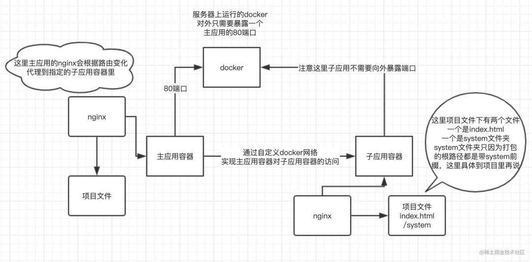 # 直接使用nginx镜像FROM nginx# 把上面配置的conf文件替换一下默认的COPY nginx.conf /etc/nginx/nginx.conf# nginx默认目录下需要能看见index.html文件COPY dist/index.html /usr/share/nginx/html/index.html# 再回头看一下部署逻辑图和qiankun注意点,必须要把所有的资源文件放到system文件下index.html才能正确加载COPY dist /usr/share/nginx/html/system再看一下主应用的